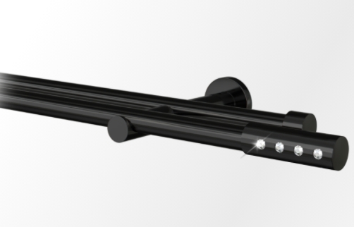 Końcówka karnisza Hera w kolorze czarnym z czterema dużymi cyrkoniami idealnie wpisująca się w ekskluzywny wystrój wnętrza, upiększy wystrój wnętrza twojego pomieszczenia. Element karnisza przedłuża jego długość o 6.3cm. Zakończenie wystarczy wcisnąć na drążek w miejscu, w którym kończy on swój bieg oraz zabezpieczyć drobnym metalowym wkrętem imbusowym. Wkręt umieszczamy od strony okna dzięki czemu jest on praktycznie niewidoczny. Kluczyk imbusowy jest zawsze dołączny do kompletu.