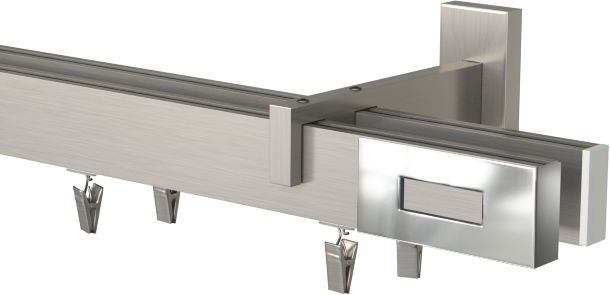 Karnisze apartamentowe podwójne na wsporniku w kolorze aluminium szczotkowane i końcówką Passion o całkowitej długości 370.7 cm. W skład naszej konstrukcji wchodzą profile apartamentowe o długości 370.00 cm, wsporniki podwójne ścienne, dwie końcówki Passion oraz ślizg z żabką w ilości 37 sztuk na pierwszy profil i ślizg z żabką w ilości 37 sztuk na drugi.