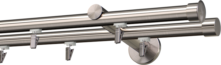 Karnisz podwójny przesuwny z wspornikiem w kolorze stali nierdzewnej i końcówkami Duo o długości całkowitej 121 cm w cenie 193.08zł. Zestaw zawiera profile o łącznej długości 120.00 na każdy z torów, wsporniki oraz 12x ślizg z żabką na pierwszy profil i 12x ślizg z żabką na drugi.